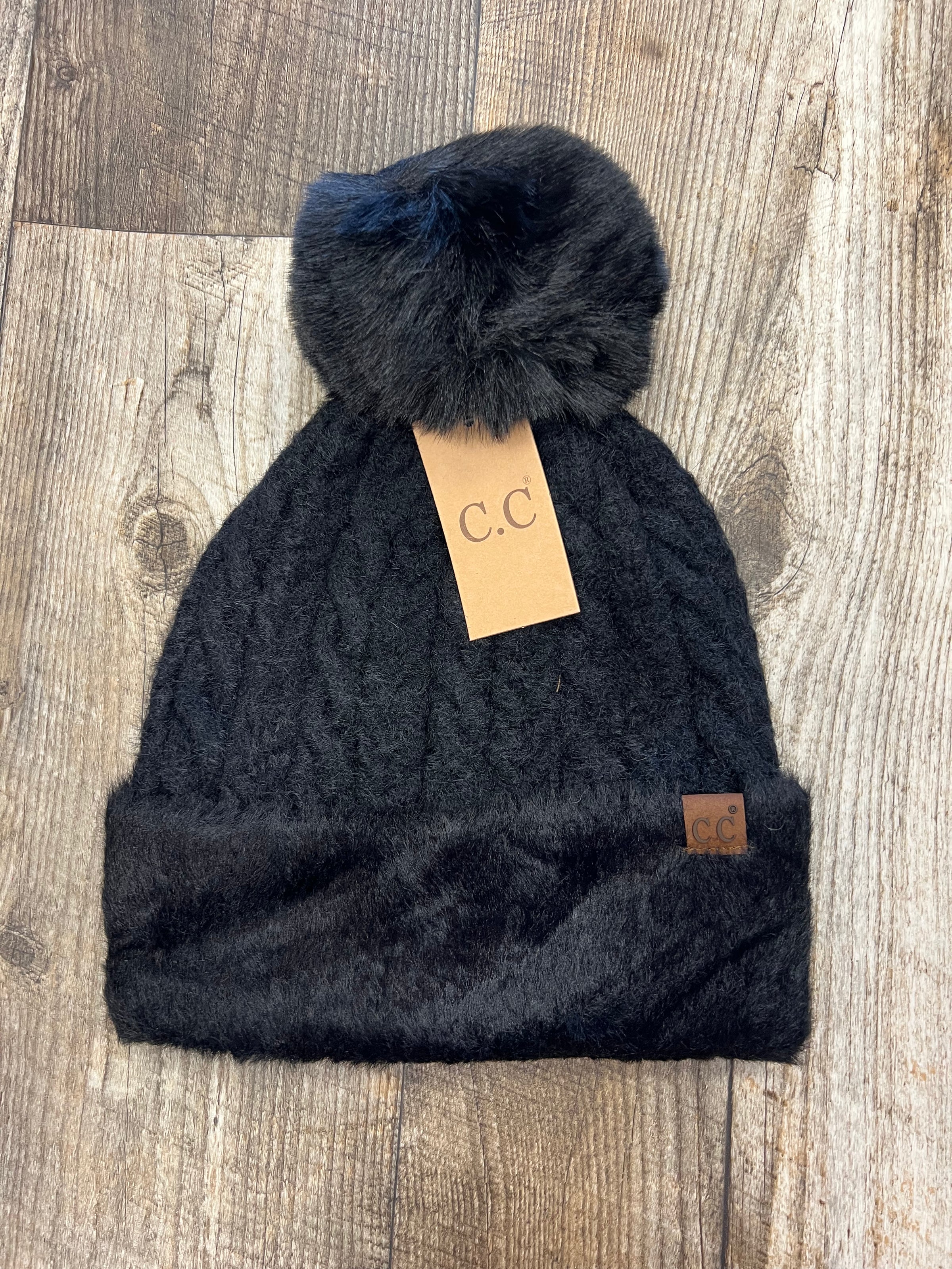 CC Cable Knit Pom Pom Fuzzy Beanie