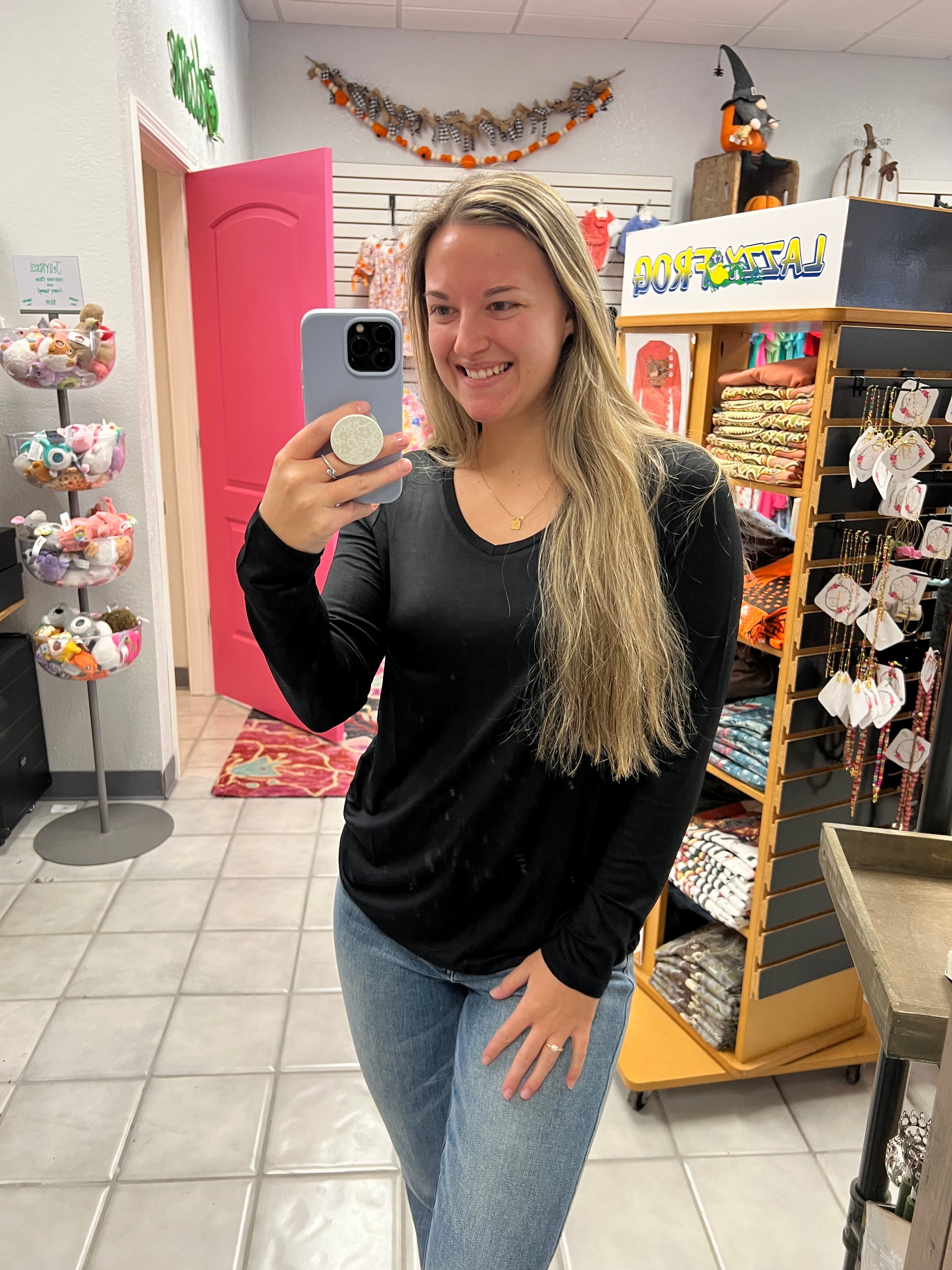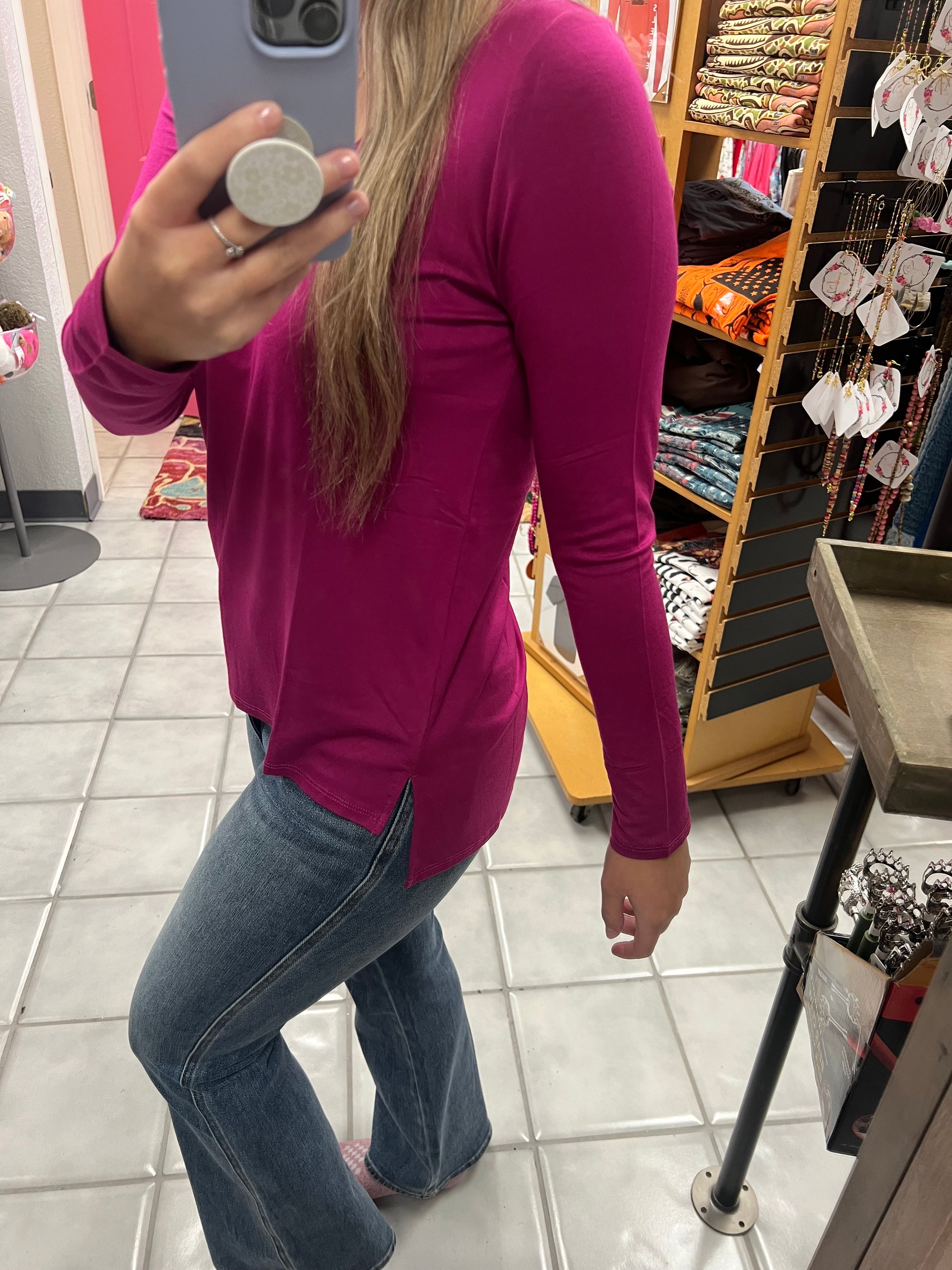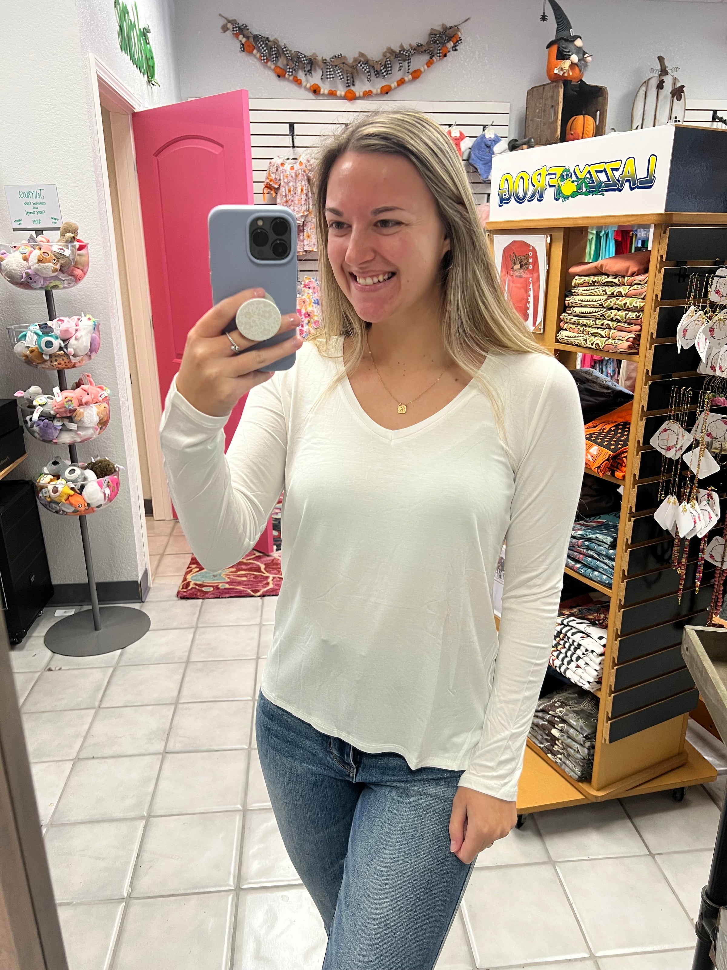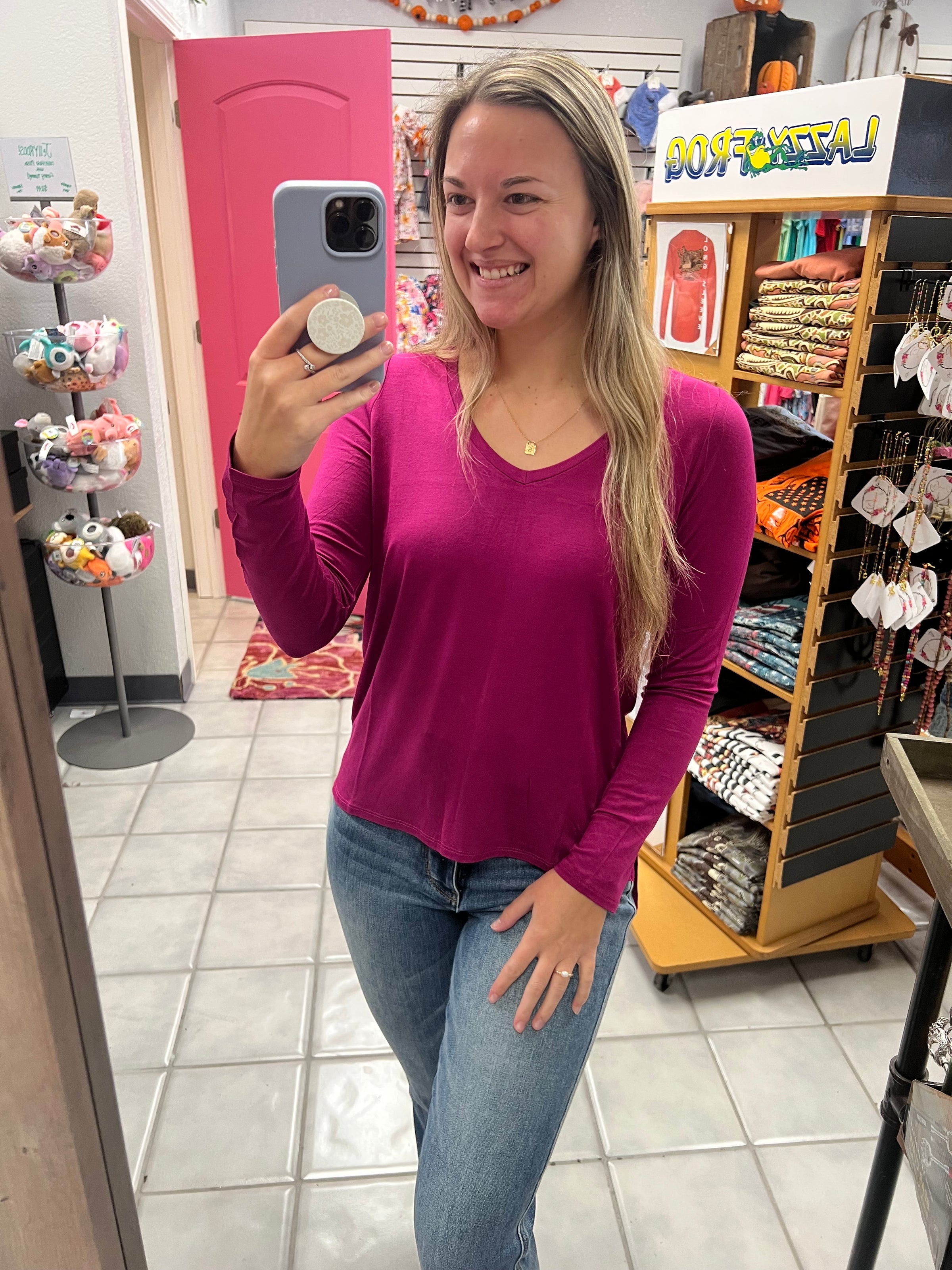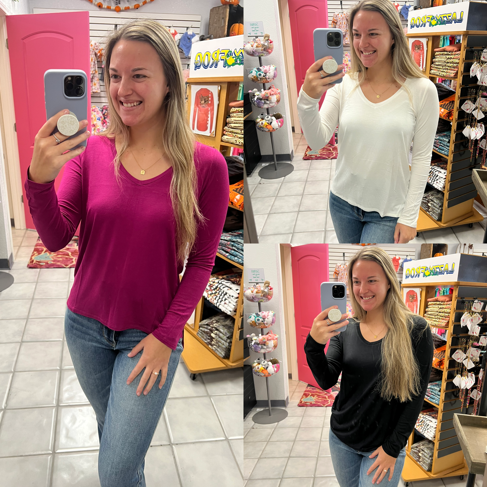 A Basic Hi/Low Top with a soft vneck. perfect for layering or to have under shackets or sweaters.