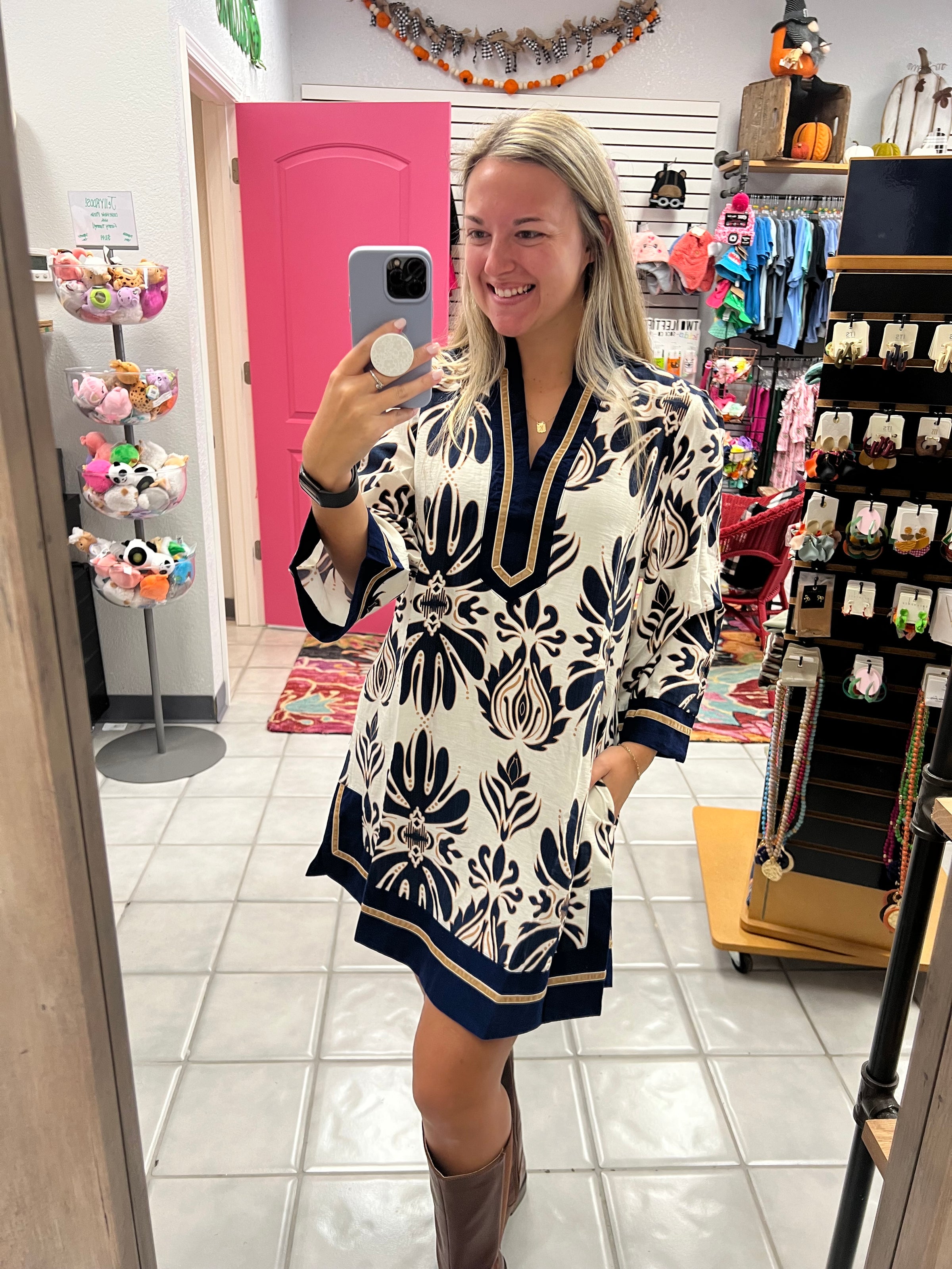 This dress features a knee length with a vneck and wide arms. It had a beautiful navy and mustard abstract design.