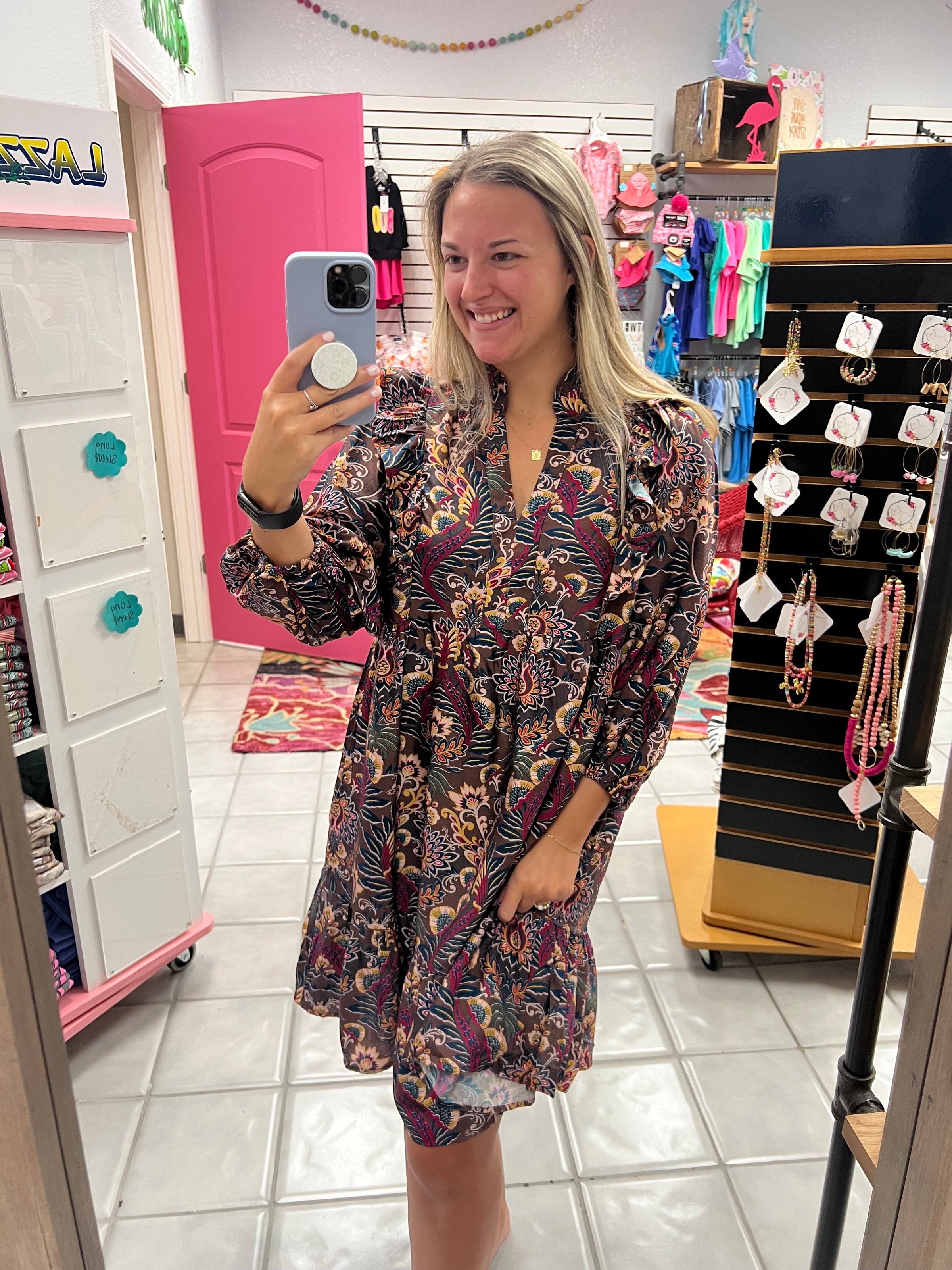 This dress is a paisley print with a ruffle long sleeve! this dress hits right at the knees, and has no lining.