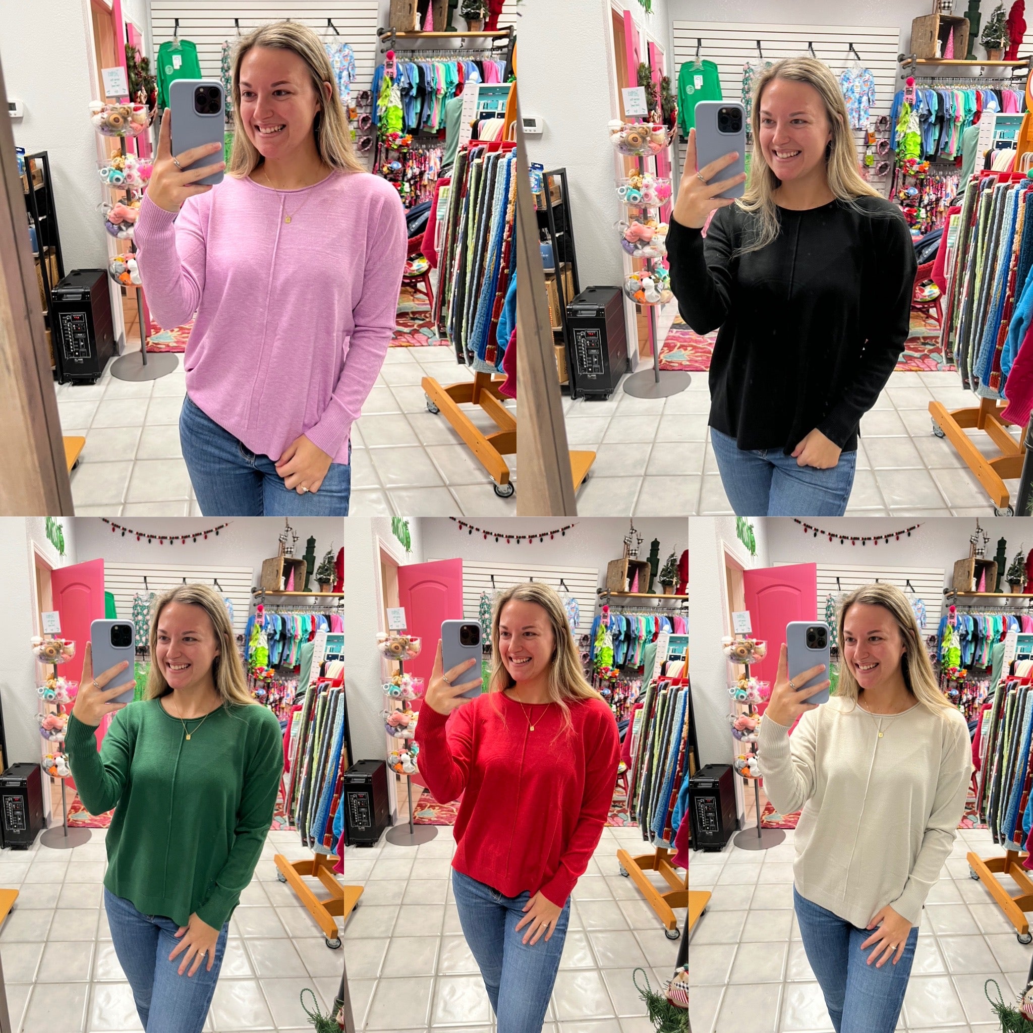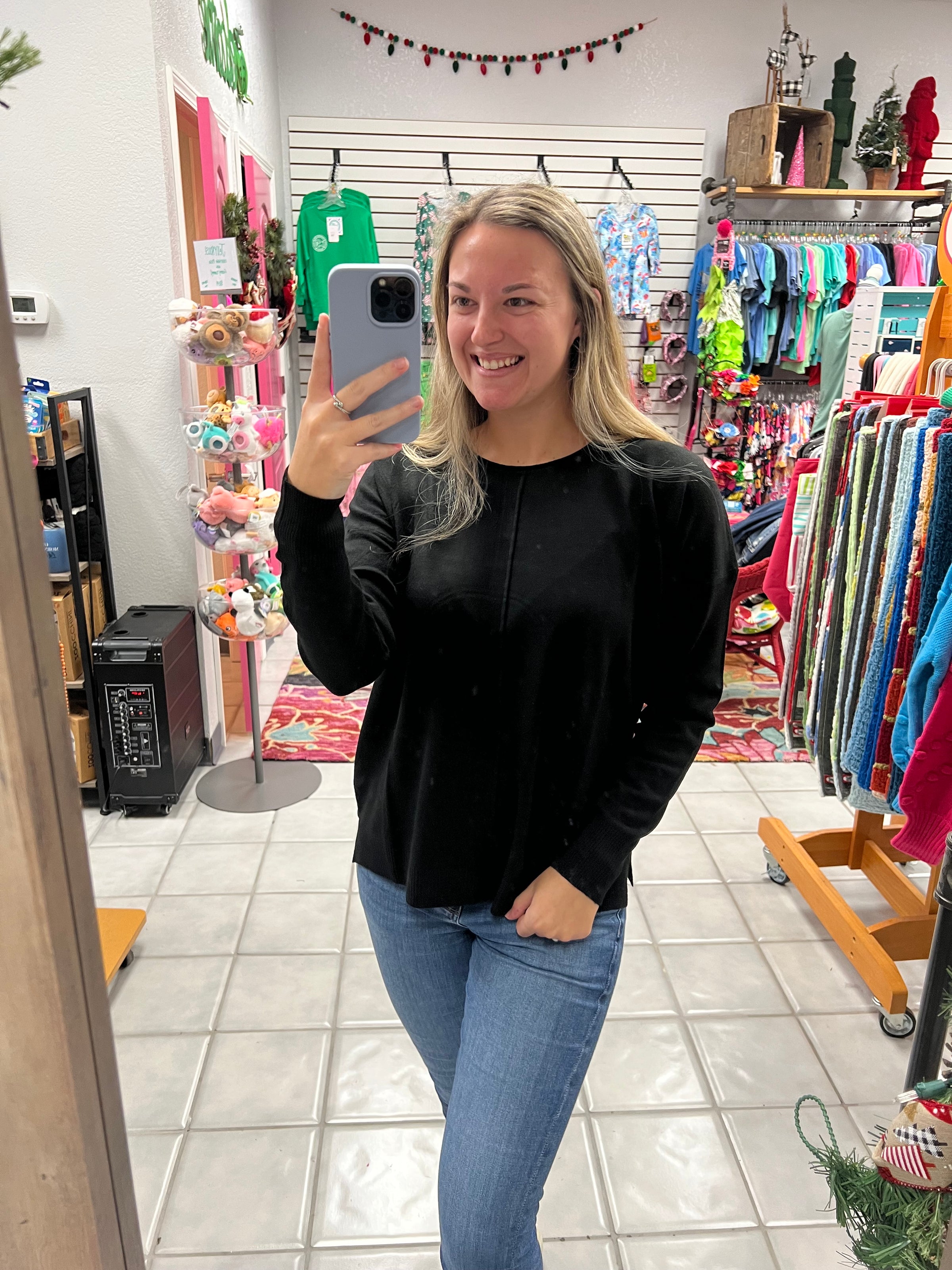 A viscose front seam round neck sweater